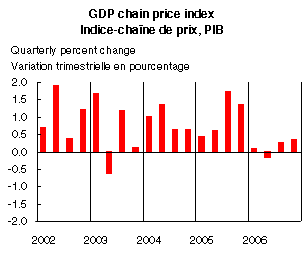 Both exports and imports ended the year on a strong note, each up nearly 4% in December, driven by a revival of the auto sector. For imports, this was a third straight increase. Exports added smartly to their upwardly revised gain in November, recovering almost all of their losses earlier in the year to stand just shy of their record set in December 2005. The monthly trade surplus rose to $5 billion, the highest in ten months. Cars led the increase in auto exports, reflecting the launch of new models after some delays in introducing new models. Exports of other manufactured goods were mixed, as a sharp recovery for consumer goods accompanied flat demand for machinery and equipment. Natural resource exports rose across the board. Industrial goods posted an eighth consecutive increase, buoyed by record-setting shipments of aluminum, zinc and nickel. Energy exports continued to rebound from sharp losses in the autumn, as prices firmed. Food and forestry exports both rose about 4%. For forestry, this was the first increase in six months, largely due to the tentative upturn in US home-building. Auto imports were boosted by both higher vehicle sales and more parts needed by assembly lines. Other consumer goods posted a fifth straight increase. Business demand for machinery and equipment surpassed $10 billion for the first time since the ICT boom peaked in 2000. December’s increase was fuelled by demand from the oilpatch. PricesThe year-over-year increase in the price of goods and services produced in Canada slowed from a peak of 4.1% late in 2005 to just 0.5% at the end of 2006. Most of the slowdown originated in export prices, which swung from a 7% increase to a 3% decline in the past four quarters. Prices paid by consumers decelerated sharply, mostly due to falling energy costs. While import prices remained little changed, the cost of both residential and non-residential construction was boosted by shortages in Alberta.