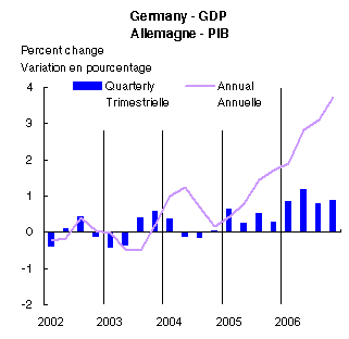Consumer prices were unchanged between December and January, slowing year-over-year inflation to 1.2%. Energy prices fell 1.6%, mostly reflecting the lower cost of filling up at the pump. Outside of energy, clothing gave a small boost to prices, as discounting by retailers during Christmas ended. The upward pressure on housing costs in Alberta began to subside, with new home prices in Calgary down slightly. The increases were partly offset by further price cuts for recreation equipment. Commodity prices continued to strengthen, recovering to their highs set early in December. Most of the turnaround originated in energy, where a prolonged cold snap across North America buttressed demand for oil and gas. Metals prices also recovered. Copper bounced back from a 10-month low to about where it started the year, aluminum hit its highest level since May, while nickel was up 20% since the start of the year to set new records. Financial marketsThere was a substantial increase in net capital inflows into Canada in the fourth quarter. For a second straight quarter, there were large foreign acquisitions of Canadian companies, especially in the lucrative mining sector. A sharp sell-off at month end left the stock market unchanged in February and up little so far this year. The drop was again led by energy as well as consumer stocks. Real estate, metals and high-tech remained in favour. Interest rates were also little changed, while the exchange rate recovered all the ground lost in January. Corporate demand for funds moderated in January, after a sharp increase in the fourth quarter. The latter was surprisingly strong in view of the record corporate financial surplus. Net savings by firms hit an annual rate of $82 billion. While corporate profits were up less than 1%, investment income was strong and lumber firms received large rebates owed by the US government on tariffs levied in recent years. As well, corporations spent much less on inventories in the fourth quarter. International economiesGrowth stalled in the United States to start the new year, with weak auto and housing demand contributing to a setback in industrial production. This followed a substantial downward revision of fourth-quarter GDP growth to 0.5%, mostly due to lower inventories. Retail sales were flat in January. Auto sales decelerated anew, as manufacturers continued to wean consumers from rebates. The burst of demand for electronic goods in November and December could not be sustained into the new year. The belated arrival of winter gave a boost to clothing demand. The tentative upturn of housing late in 2006 did not carry over into January. Housing starts tumbled 14%. The effect of the unseasonably warm start to the month was unclear. Starts rose in the northeast, which was the warmest region, but plunged 29% in the west, where building permits fell only 2%, suggesting the underlying trend of demand remained firm. New home sales tumbled 17% in January, mostly in the West. Still, consumer confidence hit a 5-year high, buoyed by a continued strong labour market. Industrial production dropped 0.5% in January, reversing all of its gain in December. Most of the drop originated in manufacturing (utility demand rebounded due to the cold snap in the second half of the month). Over half of the decrease was due to motor vehicles. Renewed cutbacks in autos were aggravated by steep declines for heavy trucks (which had boosted output in 2006 to meet higher demand before new emission standards took effect this year). The slump in housing also reduced output of construction supplies by 1%. The prospect for a pick-up in investment spending was dulled by a sharp drop in orders for capital goods in January. Output was strong in the euro-zone in the final quarter of 2006, with real GDP posting 0.9% growth, almost double its pace in the third quarter. Industrial production was strong in December, boosted by energy and a recovery in intermediate goods. New orders followed suit, more than doubling their November advance, with demand up in every sector. External trade remained brisk, although 2006 ended in a deficit as steady surpluses in chemicals, machinery and vehicles could not offset the ballooning shortfall in energy. Consumers continued to spend freely throughout the year, pushing the retail volume up 1.4%. Unemployment eased further in January to 7.4%, down nearly a point from January 2006. Similarly, inflation also trended down to an annual rate of 1.8% in January 2007 from 2.4% a year earlier. The French economy grew 0.6% in the fourth quarter after being flat in the third. Industry rebounded in December, recouping all of its losses in the previous three months. New orders, however, fell after solid gains since September. Consumer spending picked up at year end and posted its fastest gain in almost seven years in January when steep discounting boosted demand for clothing and appliances. Business confidence strengthened as inflation eased to an annual rate of 1.4% in January and the unemployment rate fell to 8.4%.
