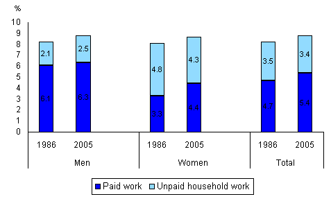 Average time per day spent on paid and unpaid work activities, men, women and total, 1986 and 2005